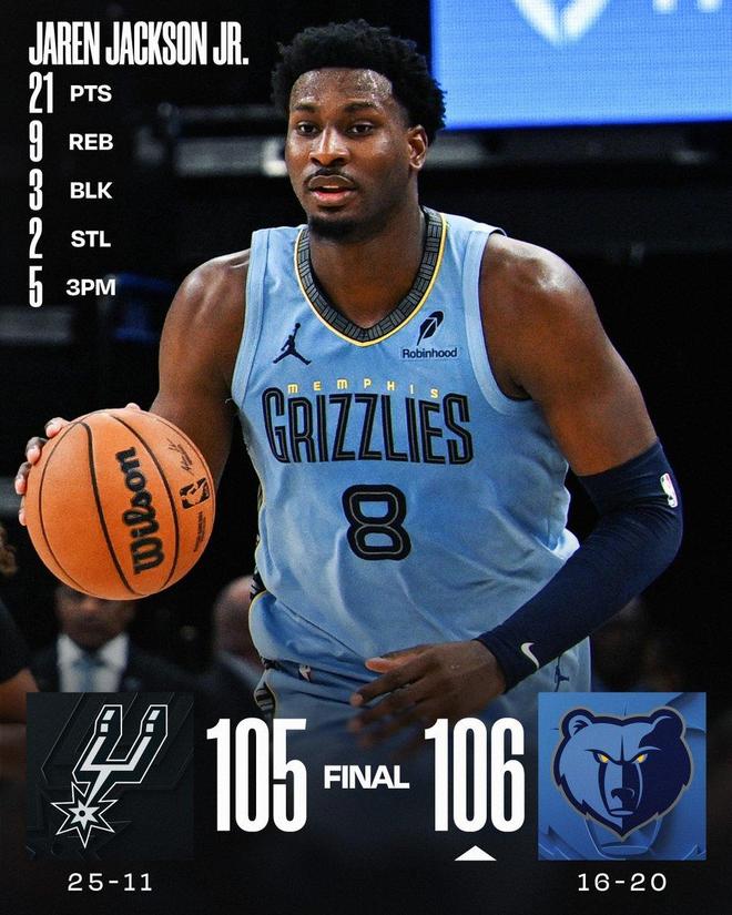 斯潘塞在中遠(yuǎn)距離獨(dú)得5分,索漢外線打鐵,福克斯中距離不進(jìn),最后一攻的絕殺球還被阿爾達(dá)馬封蓋。最終,灰熊以106比105險(xiǎn)勝馬刺,上演了11分逆轉(zhuǎn)好戲。圣安東尼奧吞下了2連敗,雖然繼續(xù)排名西部第2,但是僅僅領(lǐng)先湖人(西部第3)1個(gè)勝場(chǎng)差。